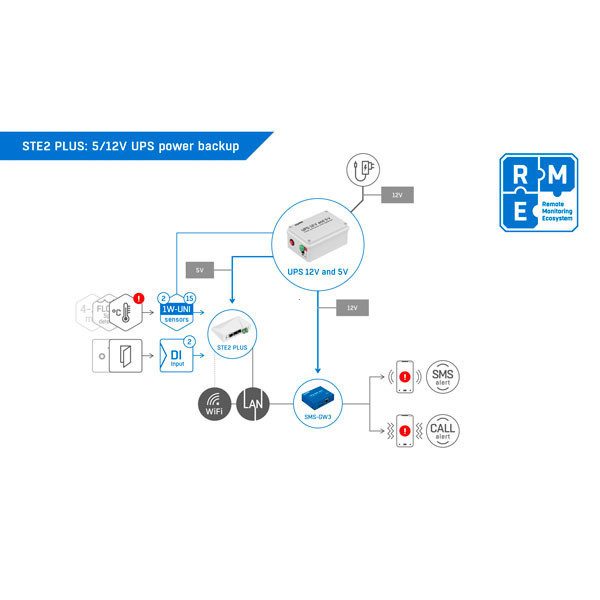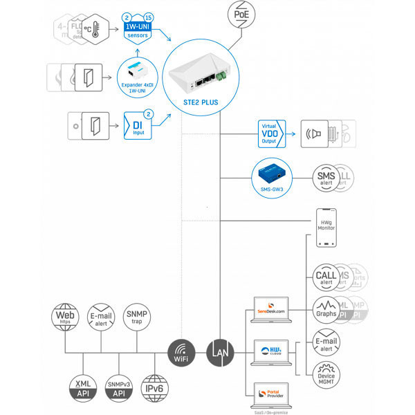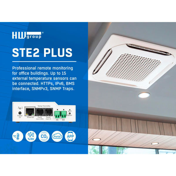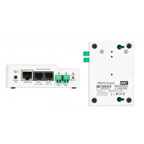 STE2 PLUS is a professional LAN & Wi-Fi monitoring device designed for reliable remote sensing in IT rooms, healthcare, industry, and cold-chain. Connect up to 15 sensor values via 2 × RJ11 (1W-UNI) ports and 2 × Digital Inputs (DI) for dry-contact detectors.