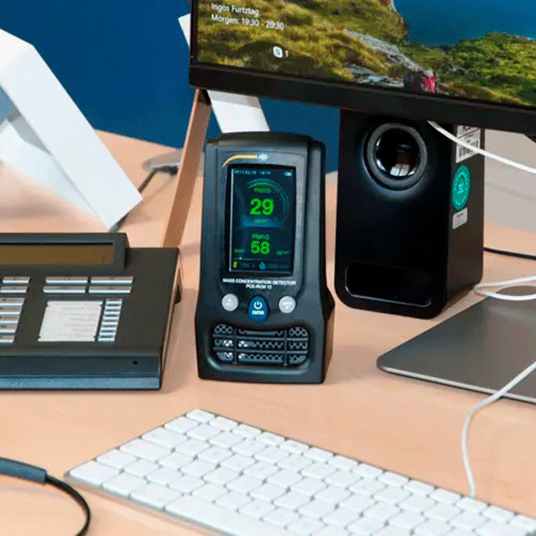 Thanks to the integrated rechargeable battery, the particle counter can be used for up to 5 hours in stand-alone operation without mains power. For continuous monitoring, the device can be powered via the USB interface. A coloured bar graph makes it easy to interpret the CO2 concentration, giving the user an instant indication of air quality.