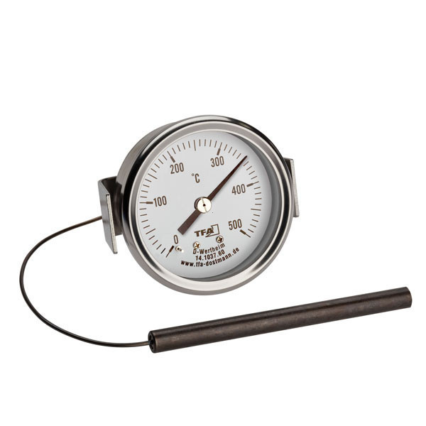 The flexible 150 cm metal probe inserts directly into the cooking chamber, accurately measuring temperatures from 0 to 500°C. This analog device is a must-have for professionals and enthusiasts working with high-heat ovens and smokers.