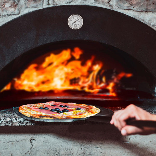 Easy to install, this thermometer fits seamlessly into pizza ovens, wood-fired ovens, stone or bread ovens, and grills. It mounts securely via a pre-drilled hole (ø 60 mm) with a mounting rim and three screw holes, keeping the glass-covered temperature scale visible at all times.