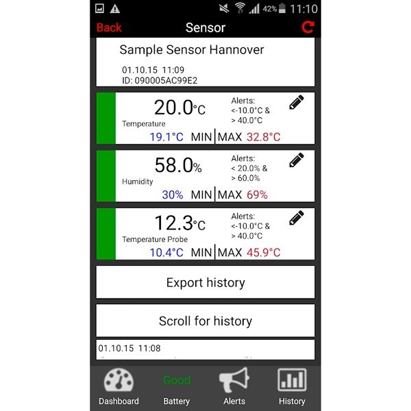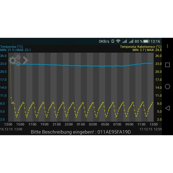 The wireless sensor sends the measured values directly to a server via the gateway module and the Internet. There all data is available for at least 90 days.