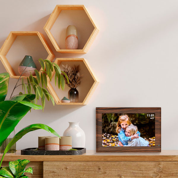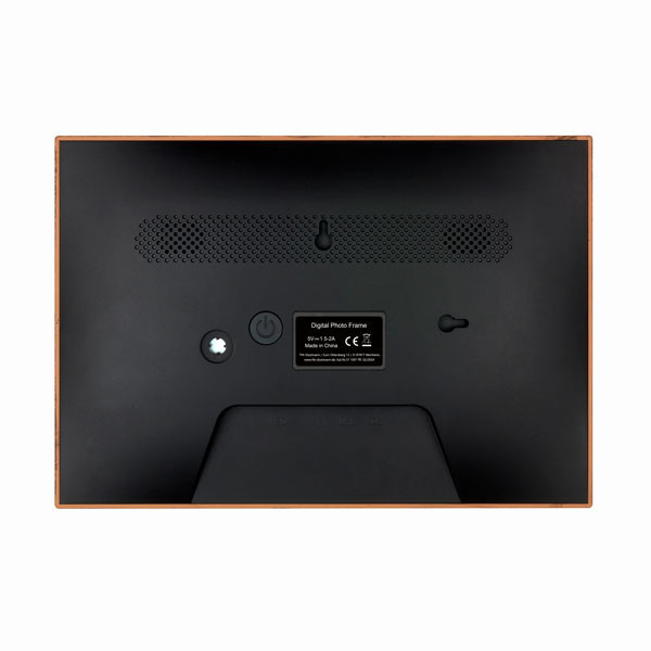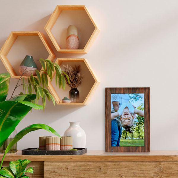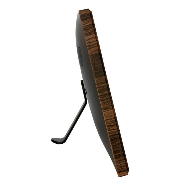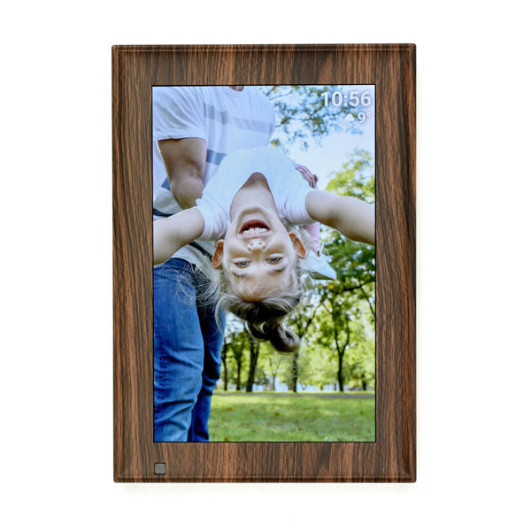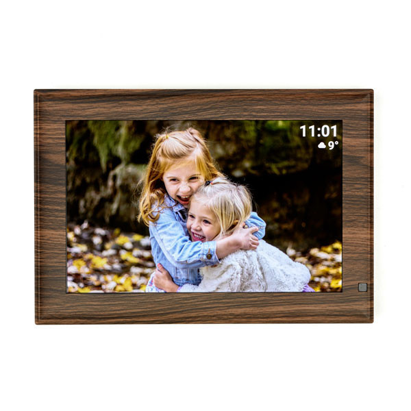 Com design elegante em madeira escura, pode posicionar a moldura em formato horizontal, vertical ou pendurá-la na parede, graças ao suporte e ao gancho de parede incluídos. O dispositivo economiza energia com um sensor de movimento que ativa o ecrã apenas quando alguém está por perto.