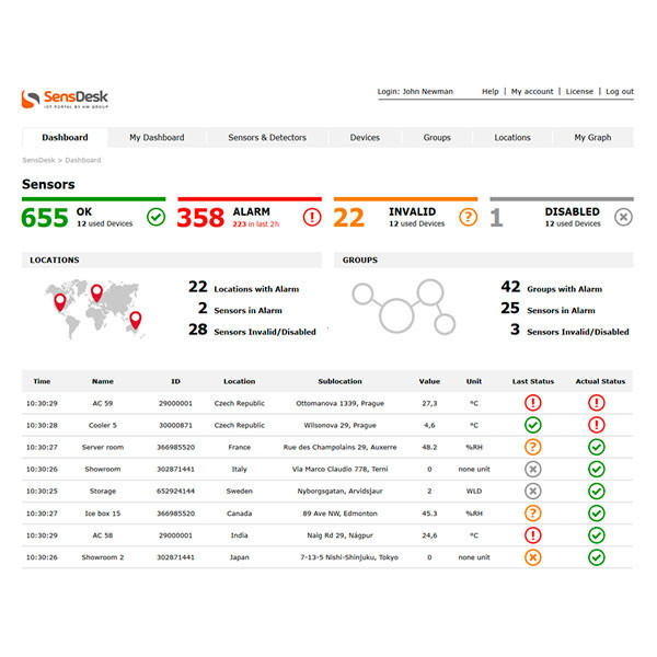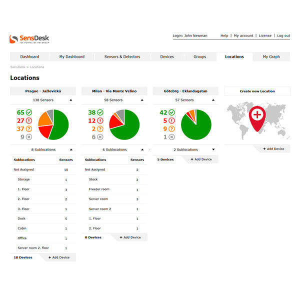 O portal SensDesk IoT disponibiliza uma visão rápida dos valores atuais, gráficos até 3 meses, e configuração de alarmes por e-mail ou SMS (via HWg-SMS-GW3). Já o HWg-PDMS permite consolidar dados de consumos, convertê-los em relatórios Excel e documentar condições ambientais em ambientes regulamentados, como farmácias e indústria alimentar.