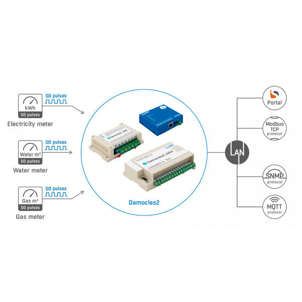 Cada entrada digital inclui um contador de impulsos S0 de 32 bits com memória, permitindo ligar contadores de água, gás, eletricidade ou outros medidores de consumo.