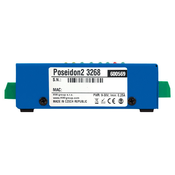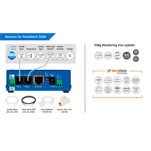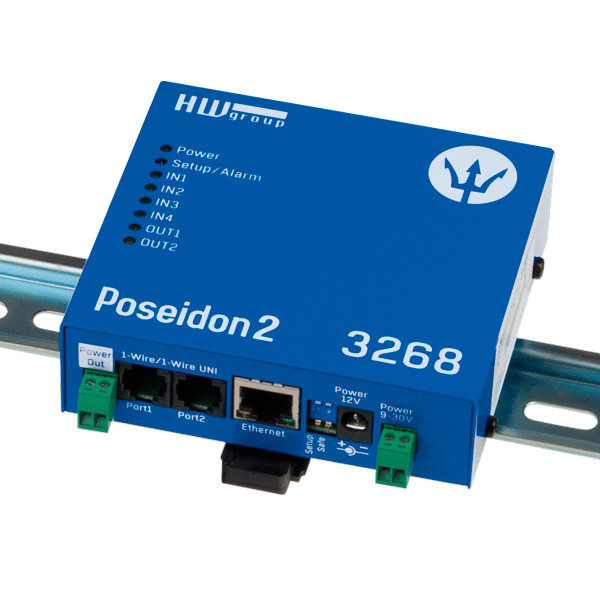 Poseidon2 3268 é um gateway de monitorização ambiental e I/O para Ethernet que suporta até 8 sensores 1-Wire UNI/1-Wire e 4 entradas digitais, com 2 saídas de relé NO/NC e 8 Saídas Digitais Virtuais (VDO) remotas.