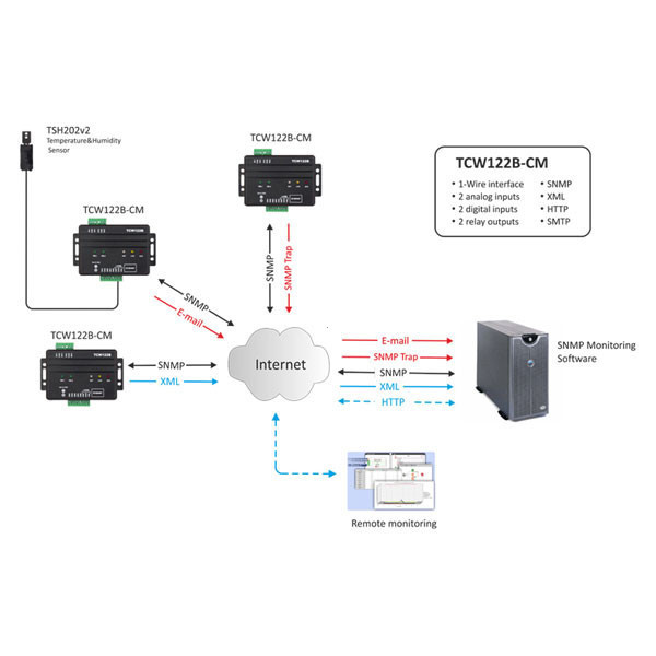 O TCW122B-CM serve para monitorizar remotamente parâmetros ambientais e estados elétricos, além de permitir controlo remoto de equipamentos através dos seus relés, sendo adequado para salas técnicas, centros de dados, armazéns, escritórios e automação industrial.