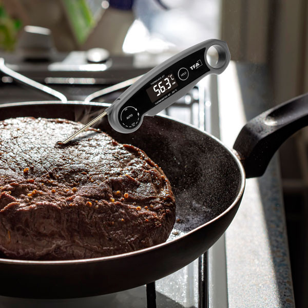 Graças à sua sonda de penetração em aço inoxidável, mede a temperatura no núcleo dos alimentos em apenas alguns segundos, apresentando valores precisos até uma casa decimal. A função HOLD permite manter a leitura visível, mesmo após retirar a sonda.
