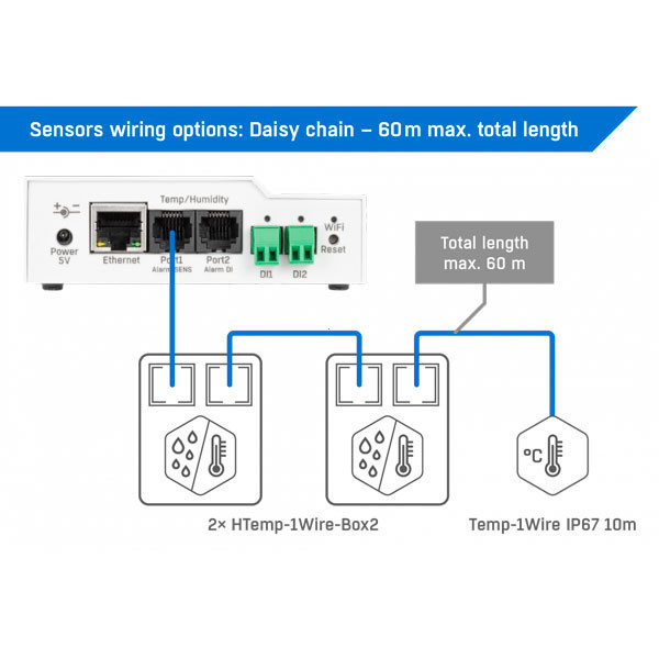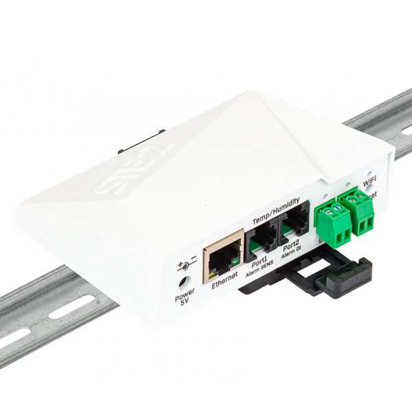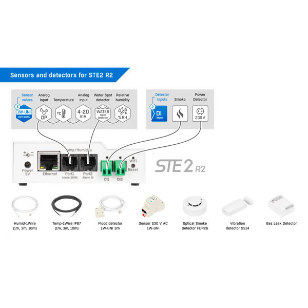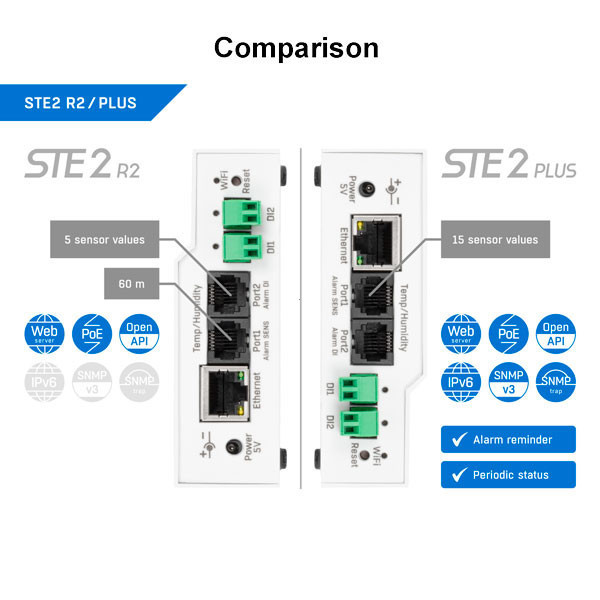 O STE2 R2 é uma solução fiável de monitorização ambiental remota. Liga-se por LAN (RJ45 com PoE) ou Wi-Fi, envia alertas por email e integra via SNMP / XML (API aberta) e cloud (SensDesk / HWg-cloud). Inclui sensor de temperatura IP67 (3 m) e 2 entradas digitais (DI).