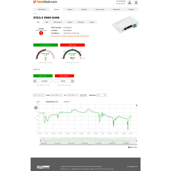 Ligue por LAN ou Wi-Fi, aceda ao servidor WEB (HTTPS), adicione sensores/detetores e defina intervalos seguros (Min-Max) e política de emails. Para SMS/voz use SMS-GW3 / SMS-GW3 LTE. Para maior fiabilidade a longo prazo, use o Portal (HWg-cloud / SensDesk).